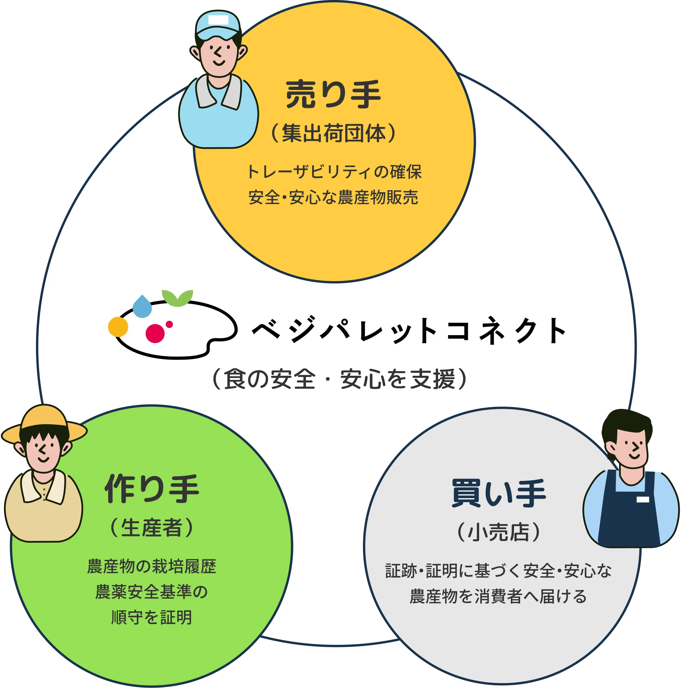ベジパレットコネクトは、単なる業務効率化ツールではありません。売り手・作り手・買い手がそれぞれに実現したい「食の安全・安心」を守り、