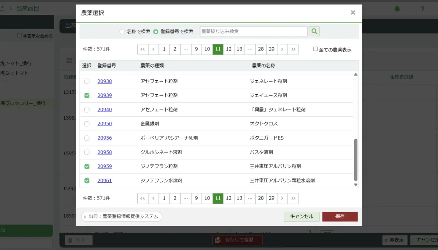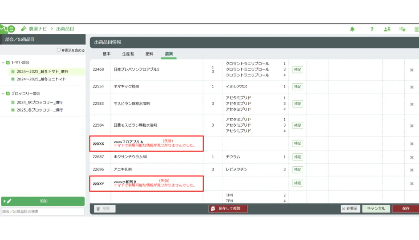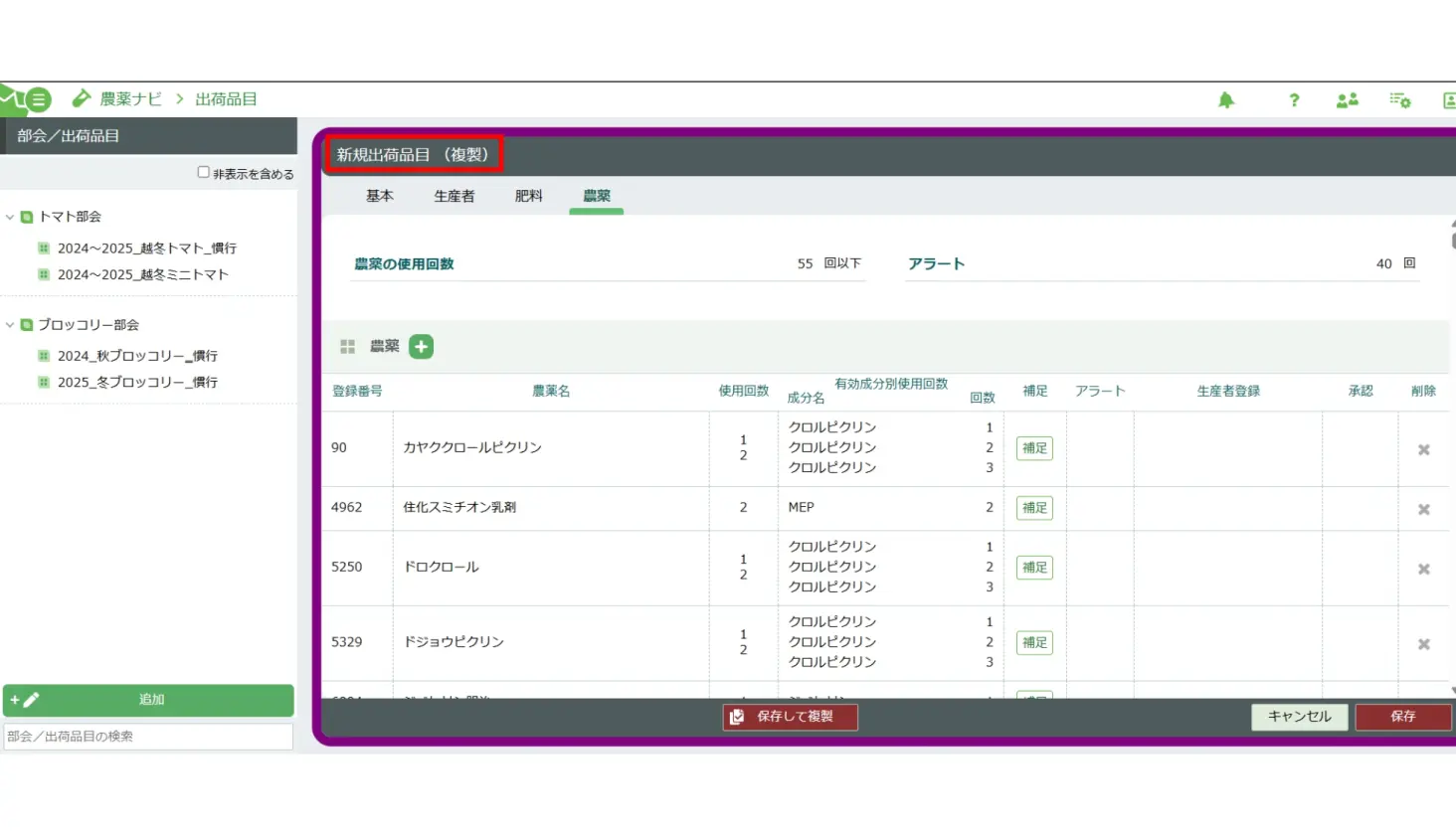 また、昨年度の出荷品目の情報をコピーして新規作成できるので、引き継ぎたい農薬情報はそのままに失効農薬の情報を反映して活用できます。集出荷団体の業務効率化をコピー機能で支援します。