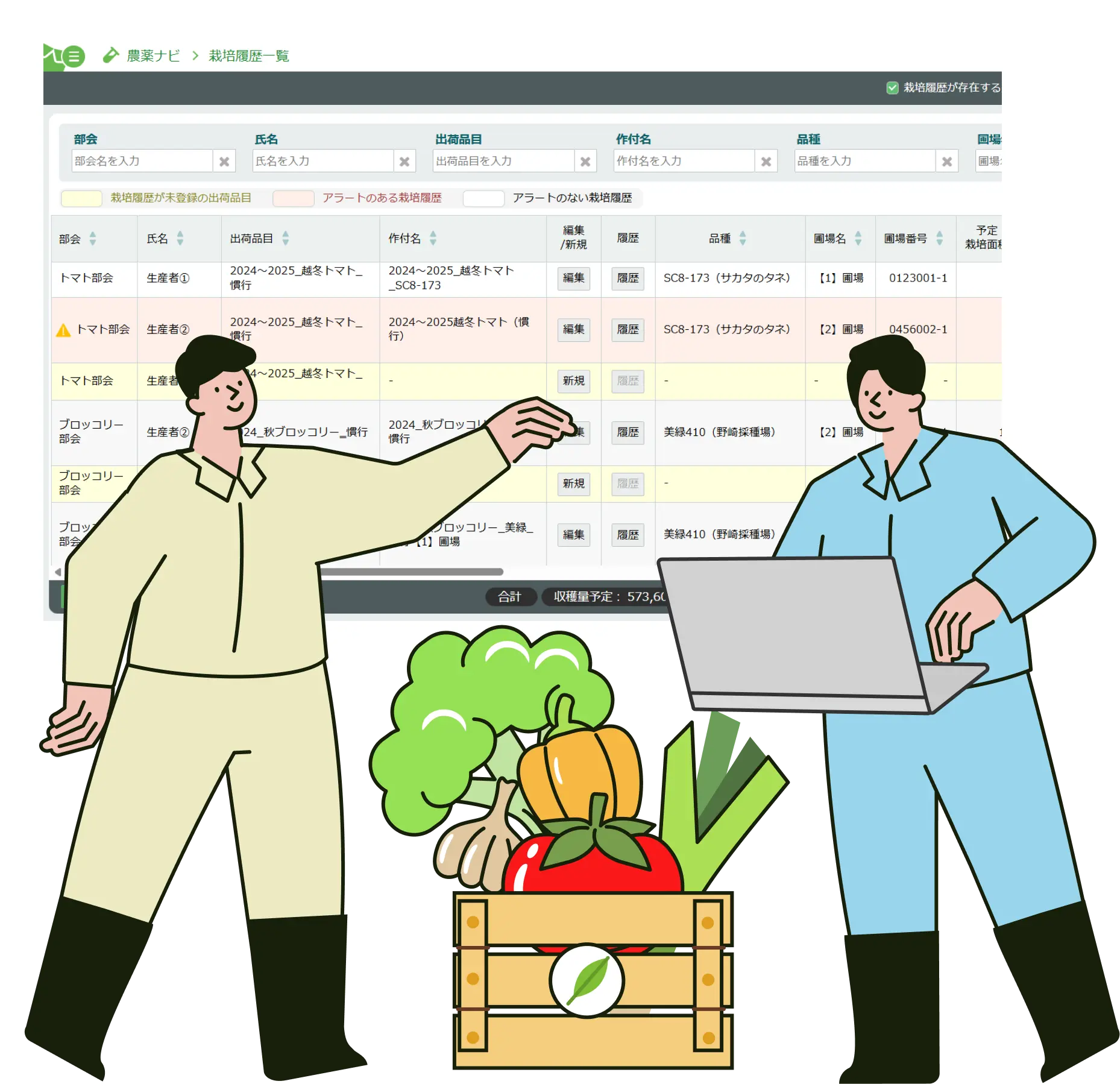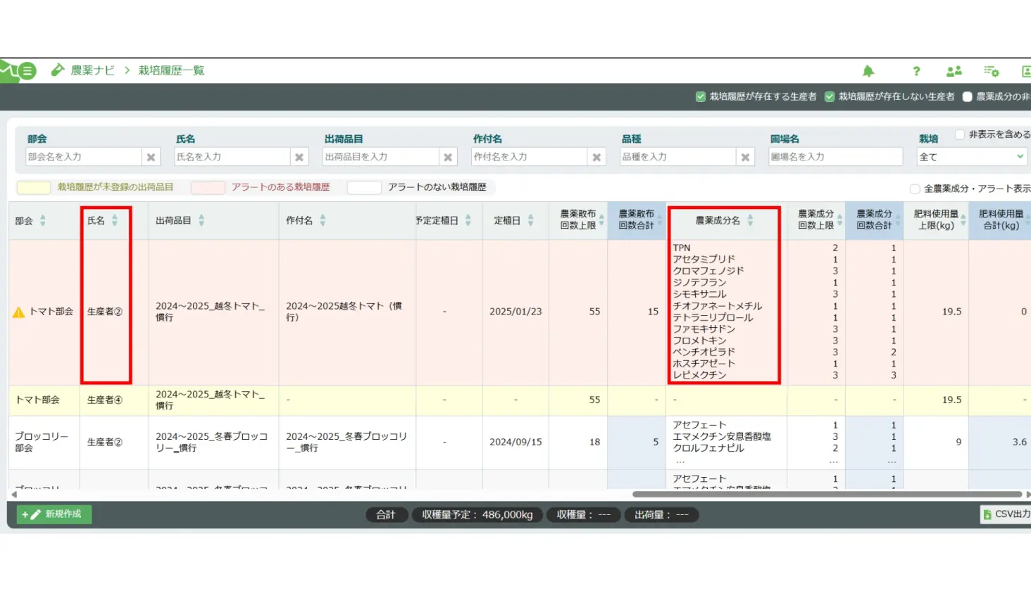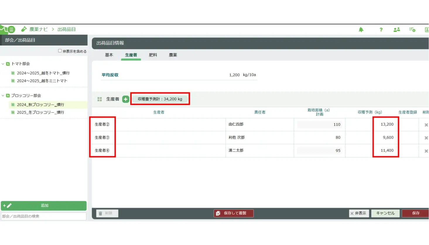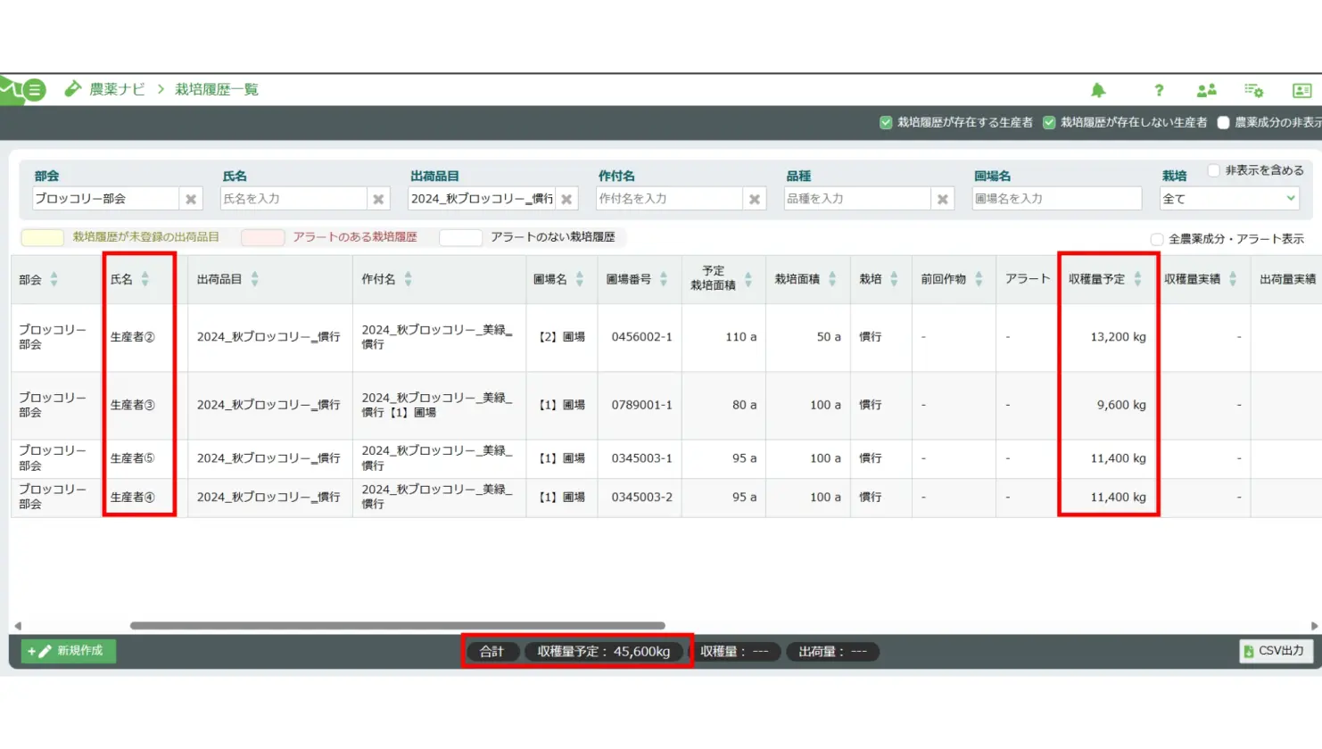 各生産者の播種日、定植日、圃場面積、予測収穫量を容易に確認できます。