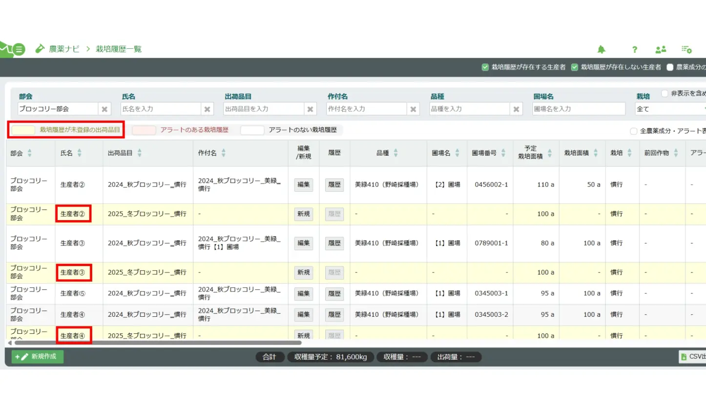 出荷時期を意識して 部会で決めた播種時期(定植時期)に対してどの生産者の、どの圃場で実施できているのか(いないのか)一覧で確認できます。